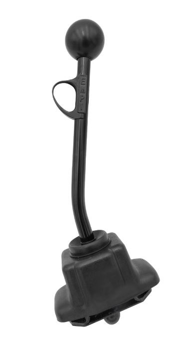 Fits: Beetle & Ghia. Features round powdercoated black shaft with sliding trigger to release reverse lockout. Height from flat mounting plate to top of shift knob is approx 12". Note, reverse lockout is built into the shifter, no need for the stock lockout plate.