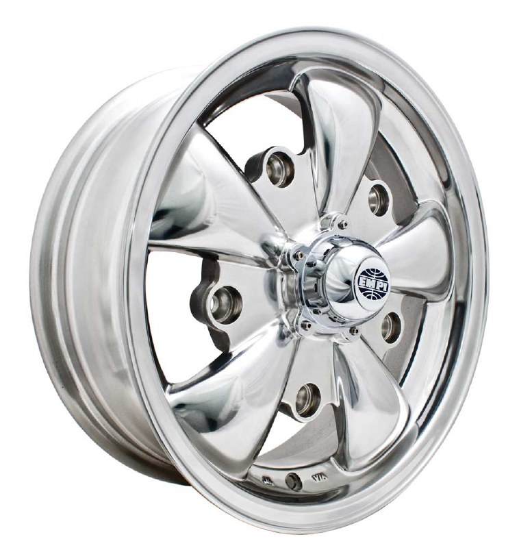 EMPI GT-5 5/205 15x5.5 ET 20. Polished. NICE BOLT ON CENTRE CAPS INCLUDED. Use with cone seat bolts or studs/nuts.