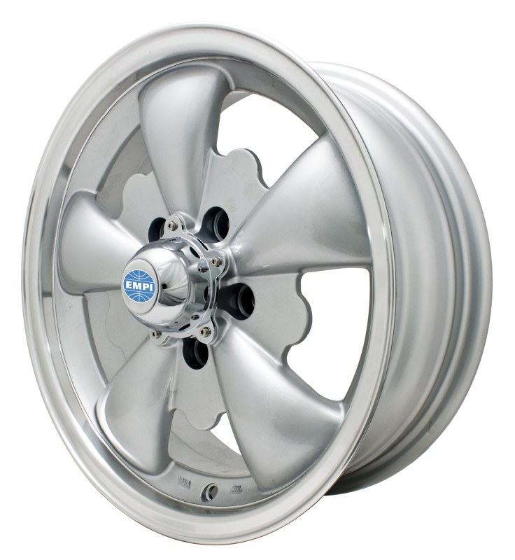 EMPI GT-5. 5/112 15x5.5 ET20 Silver with Polished Lip. Chrome plastic centre cap.