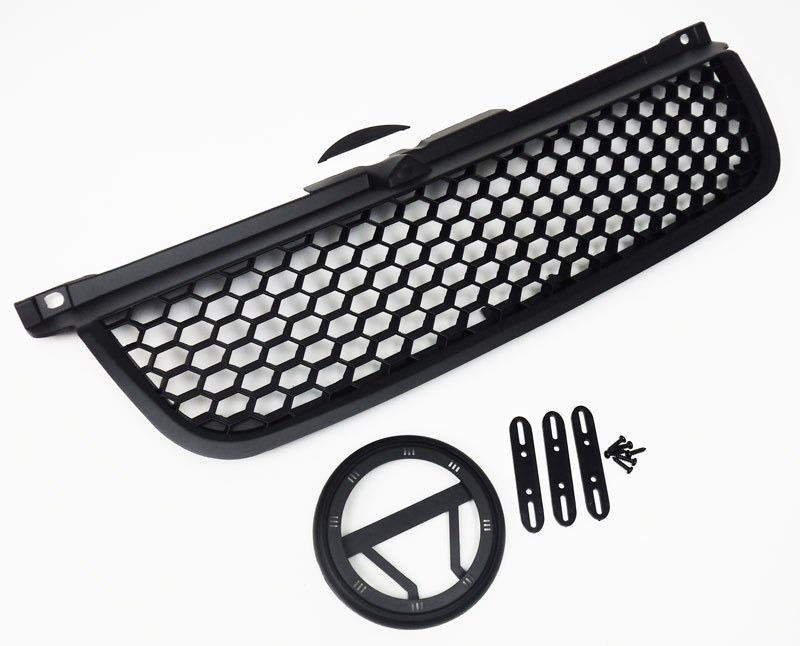 Jetta 4 Honeycomb grill. Matte black. Install with or without your emblem. Emblem holder in picture screws onto the grill. Hood filler included. Matching honeycomb bumper grills available as well, see item # BPGRVBR-FLC !