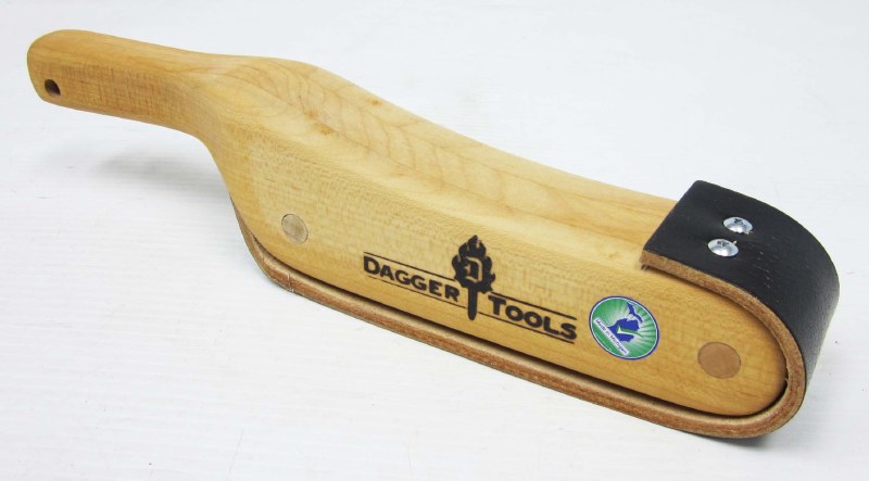 Dagger Tools Flat Faced Hard Wood Slapper, made from Midwestern grown hard maple wood, natural oil finish, flat shaped face for sheet metal panel forming, and metal shaping on auto body building & repair, aerospace panels, motorcycle building, metalworking, and metal arts. Use as you would any other style of shaping hammer with the added value of stretching large sheets that no other hammer will do along with edge shaping over sheet metal T-dollies, handle and jumbo forming dollies to create uniform surface radius. Ideally, use on a leather shot/beater bag to stretch large sheet metal panels. Includes no-mar leather face cover. 14" overall length, , 2 1/4" face width, 8 1/2" face length. Use on mild steel and aluminum. For increased capacity try our weighted wood slappers. Proudly, Hand Crafted in Michigan