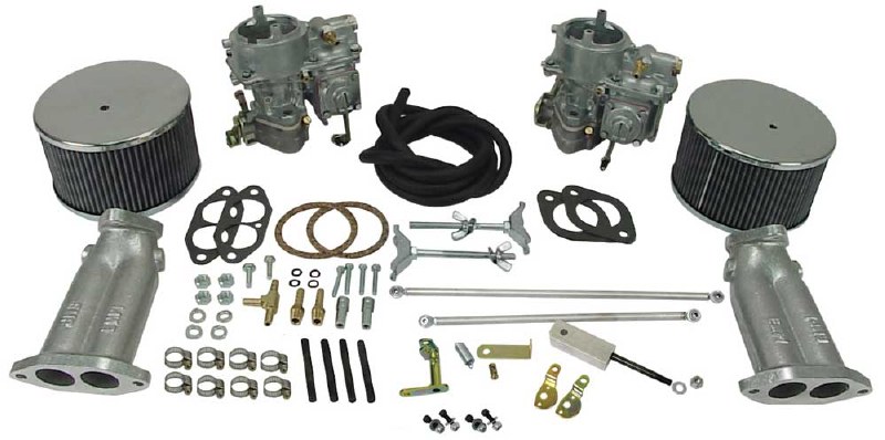 EMPI 43-4416 . NEW VERSION WITH TWIST LINKAGE ! EMPI's dual 40mm carb kit features Brosol/Solex 40mm carbs, cast Empi aluminum manifolds, chrome top air cleaners with washable gauze filters and TWIST linkage. Kit is complete with quality hardware, gaskets, fittings, hoses, and instructions. Fit all dual port 1600 style upright engines. Supplied with 130 Main Jet, 55 Idle jet, & 150 Air Jet. (air jets cannot be changed - must be drilled)