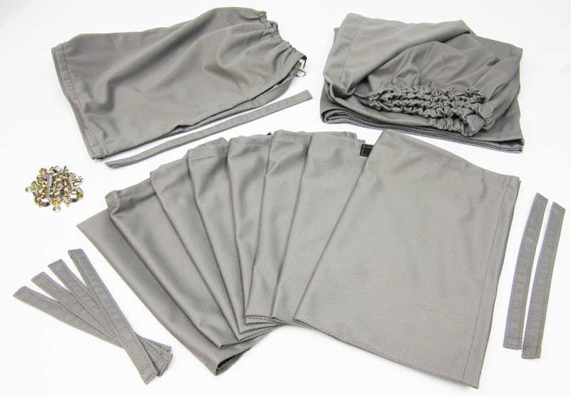 GREY. 10 Curtains, Tie backs, and Snaps. Including 1 piece front curtain. 1983-84. Curtain hooks not supplied.