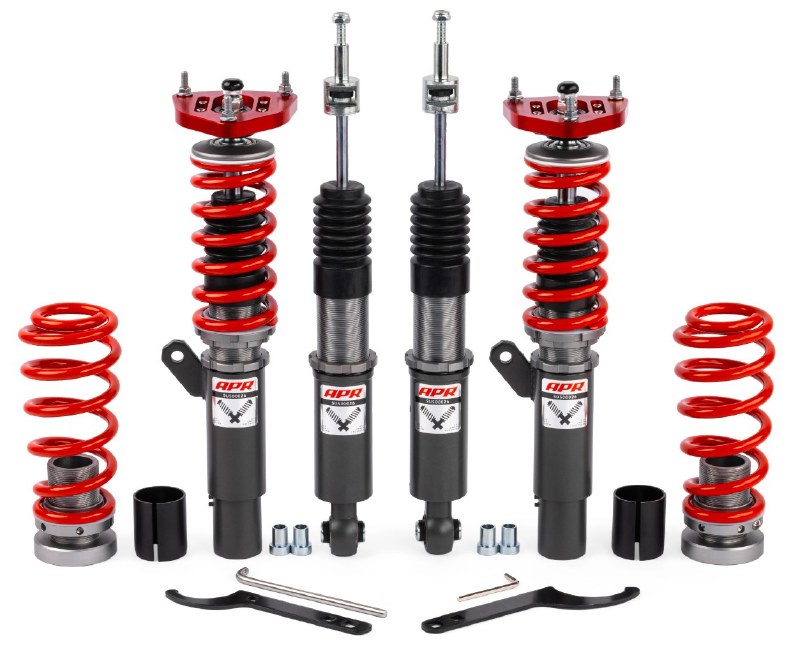 The APR Roll-Control Coilover System offers a wide range of adjustment to fully customize your vehicle's suspension setup! The system comes complete with front and rear struts and dampers, both of which have 32-points of dampening adjustment and a full range of height and preload adjustment. The fully threaded adjustable shock bodies allow for easy height adjustments without altering spring preload and travel. The front struts include camber plates that allow for dialing in your vehicle's otherwise non-adjustable front camber. In total, the system is a comprehensive upgrade that puts you fully in control to setup your vehicle for street, track, or show, all in one complete package!Suspension is often one of the first items enthusiasts tackle on their vehicle. From the factory, vehicle ride heights are intentionally placed extremely high which often leaves the show-room floor vehicles looking goofy compared to their original design intent. This high center of gravity and overly soft setup often leaves much to be desired when it comes to handling performance. With our coilover suspension system, this is eliminated. The system is fully height adjustable in the front and rear with adjustable shock bodies, allowing you to perfectly balance the height and damping to your designed specs.For the track:Track enthusiasts can corner balance the vehicle for better grip and handling with a lower center of gravity. The dampening adjustments allow you to stiffen up the shocks too perfectly match your ride height and track conditions, and the camber plates let you be aggressive to promote better turn in and handling in the most demanding situations.For the street:Every day driving is dramatically different than the track, and this system allows you to balance, comfort, looks, handling, and tire wear thought height, damping, and camber adjustments.